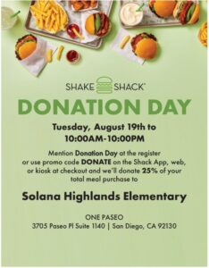 Mention Donation Day or show the flyer at the register or use promo code DONATE on the Shack App, web, or kiosk at checkout and Shake Shack will give back 25% to our PTA.
